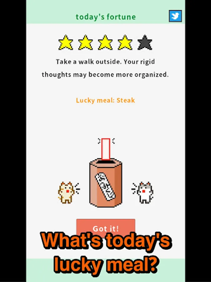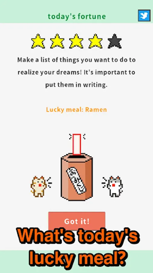 Check your daily fortune and lucky meal. Enjoy your food as a reward for not drinking!