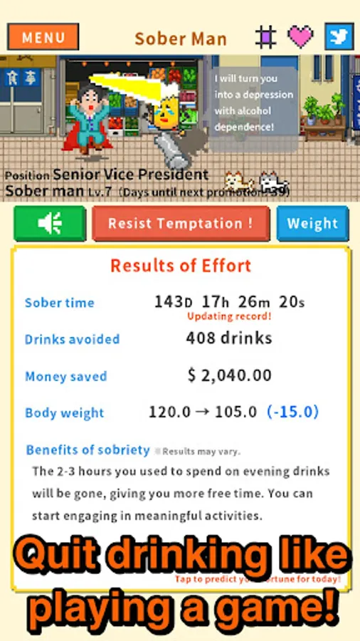 As your sober time increases, you will be promoted in your company. Overcome the temptations of the devil and aim for the position of president!