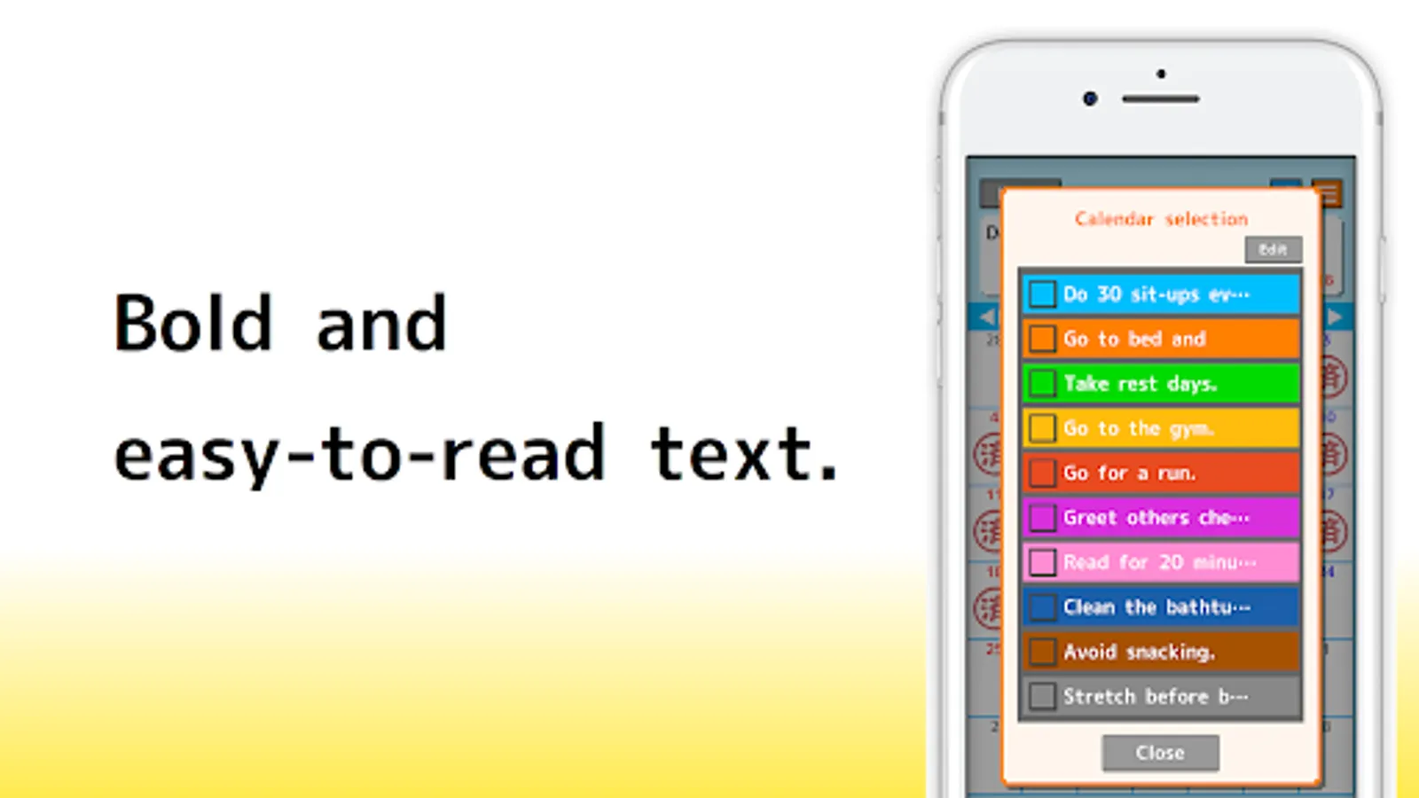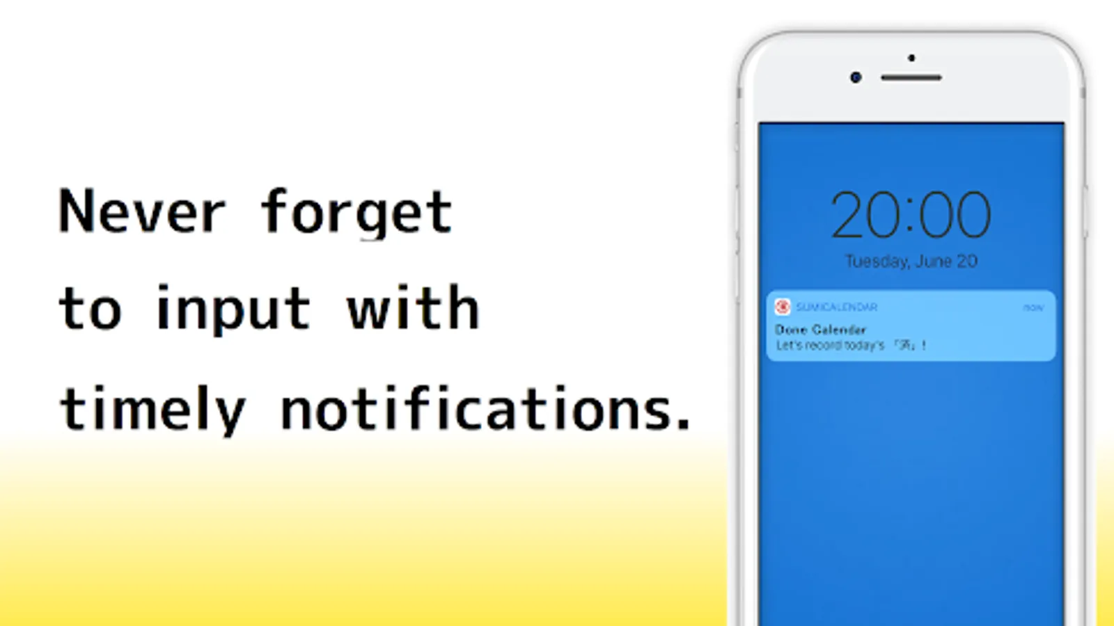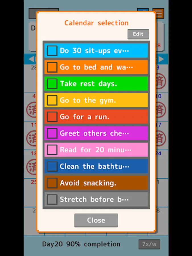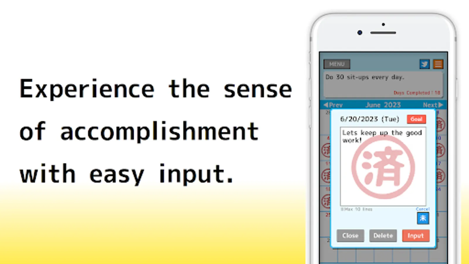 Set the habits you want to start and mark them with a "済" stamp every day you accomplish them. With a simple interface, it's easy to use!