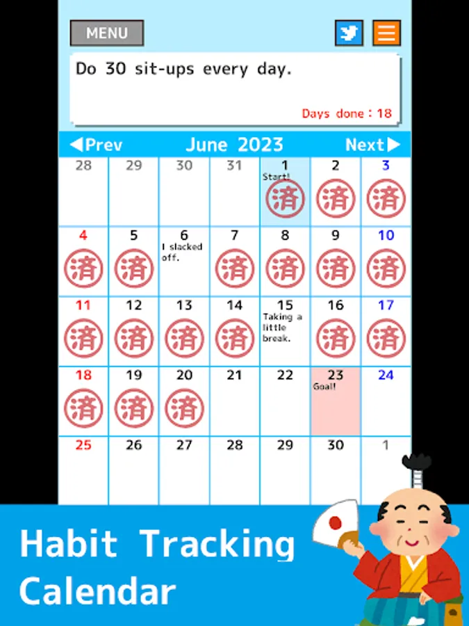 Let's press the '済' stamp when you are done with your habit for the day. Introducing a fun habit-tracking calendar app!