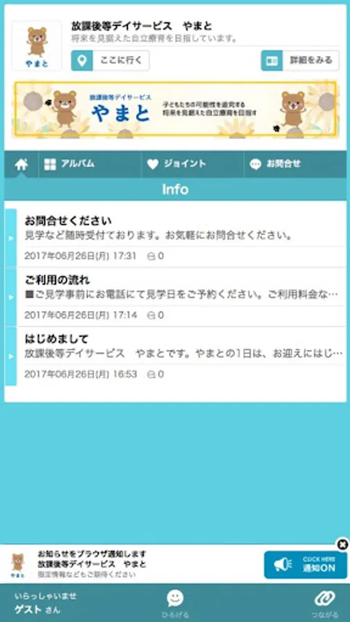 It is the Treatment and Education Institution to support the growth of the child you have a variety of disabilities. According to the state of the child, incorporating a reasonable program, make the nursing activities aimed at improvement of physical fitness, life skills and social. From interaction with other children and teachers, also performs adaptation practice to the collective life through a variety of experience and experience. Also established a children's living environment, with an emphasis on each and every different interests and concerns, and strive to help pull out the "motivation", "spontaneous," "self-selection", "sense of achievement". While to cherish the needs of parents who, who each teacher to self-support of children will work with full force. Why do not we nurtured both a "stumbling" "see Power," "listen Power," "the power to express" in life?