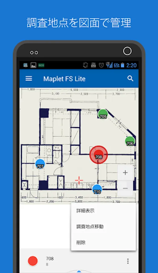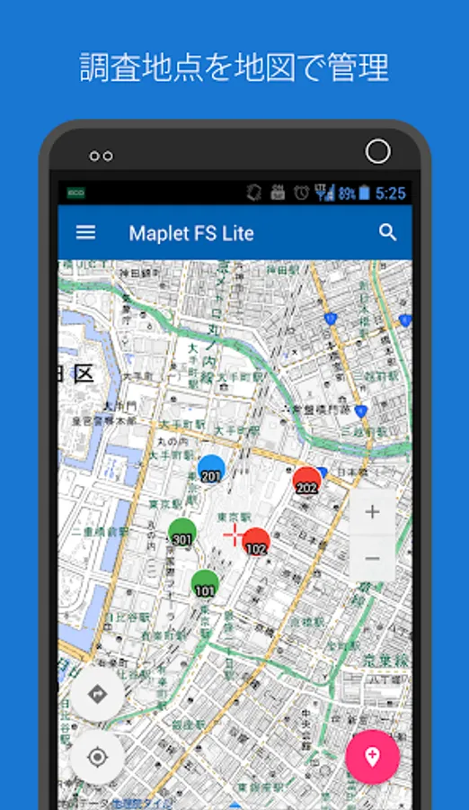 Maplet FS Lite は、フィールド調査や点検・検査などの「現地調査」業務で、地図や図面を使って効率的に調査地点の情報を管理できるアプリです。