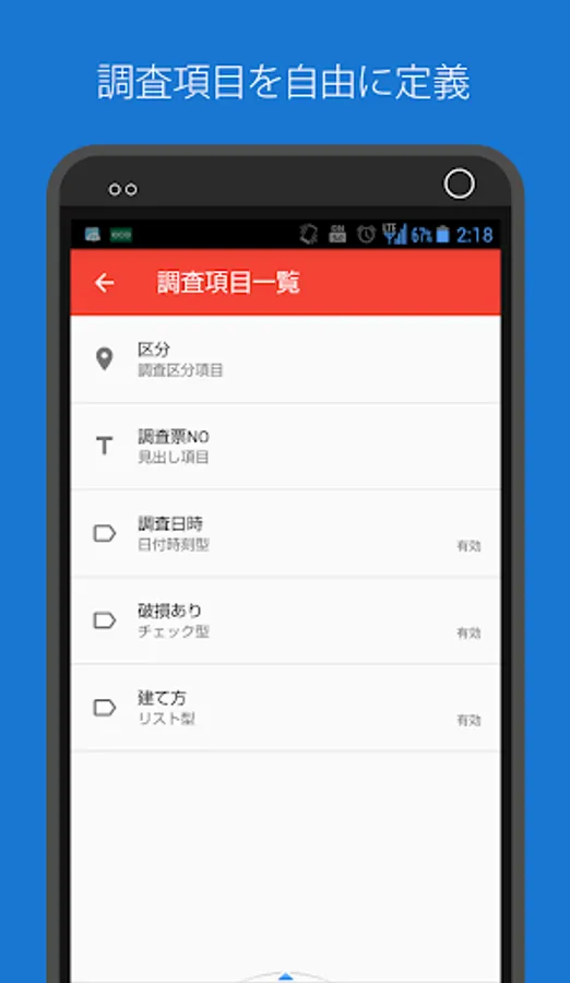 (文字列型、整数型、小数型、マスタ型、チェック型、日付時刻型)