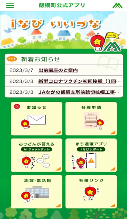 Iizuna Town's official app "iNavi Iizuna" is the Iizuna Town portal app that serves as the starting point for accessing various services provided by Iizuna Town. You can spend your life more comfortably with convenient functions that utilize the power of digital, such as receiving necessary information tailored to you by push type, understanding what you want to know with a chatbot, and easily obtaining certificates. I will help you.