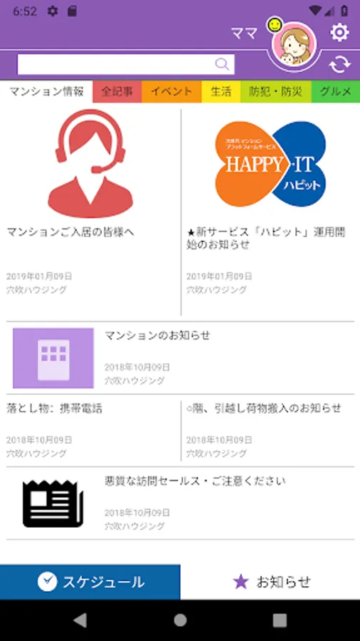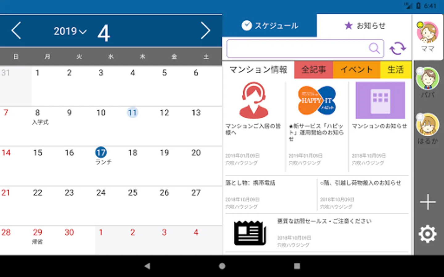 穴吹ハウジングサービスが管理運営するマンションにおけるスケジュール、お知らせ並びに近隣の行政に関する情報や企業の情報を確認することが出来るアプリです。マンションのメンテナンス情報や定期通知を確認したり、カレンダーにスケジュールを登録することで、地域のイベントや自分の予定を簡単に管理することが出来ます。