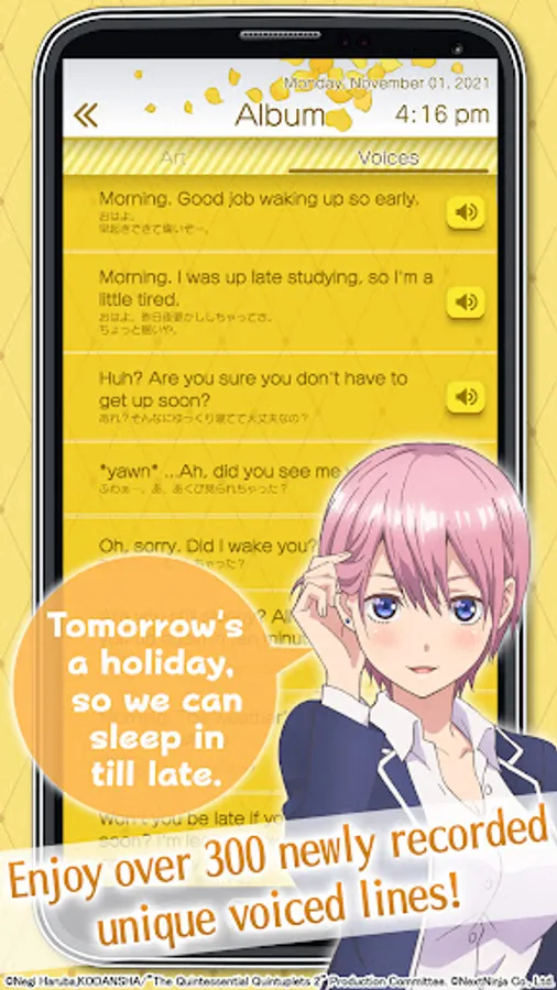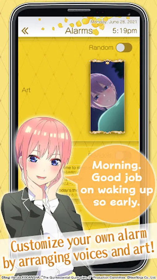 Enjoy arranging the different voiced lines and art to customize your own unique alarms!