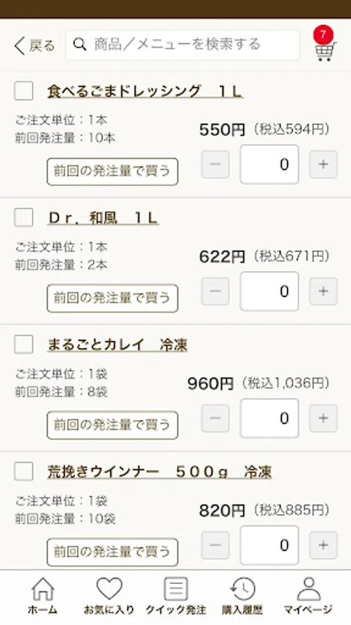 カテゴリ検索やキーワード検索で商品を探すことができます。また、一度ご購入いただいた商品は「クイック発注」機能をお使いいただくと、前回の発注日や数量等、リピート買いに必要な情報をわかりやすく表示し、複数の商品でもまとめ買いがしやすくなっています。