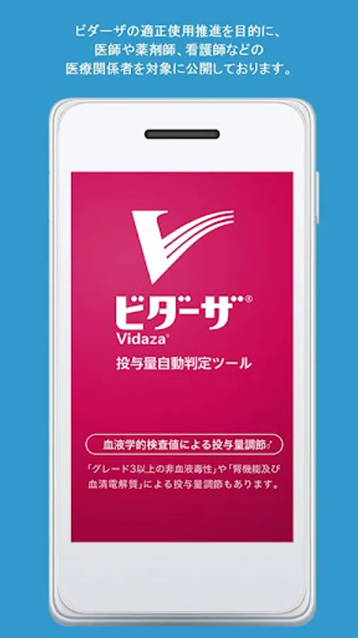 本アプリは、ビダーザの適正使用推進を目的に、医師や薬剤師、看護師などの医療関係者を対象に公開しております。