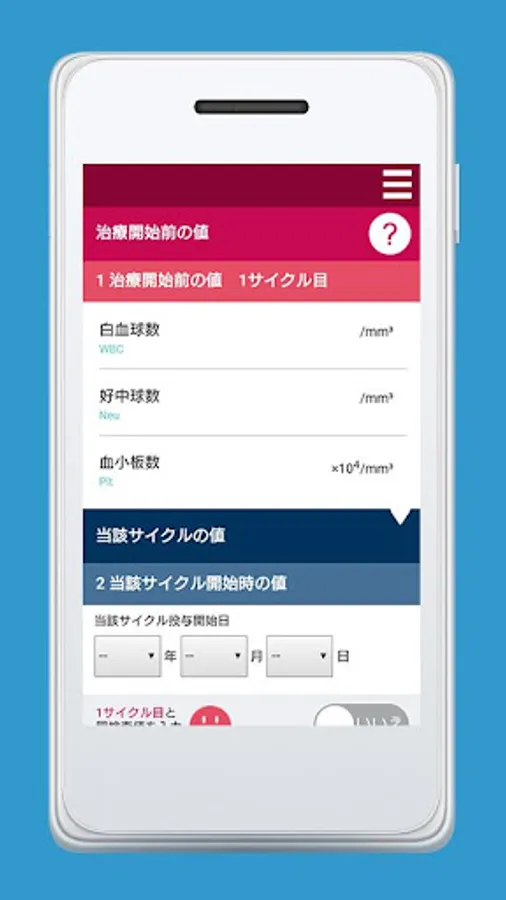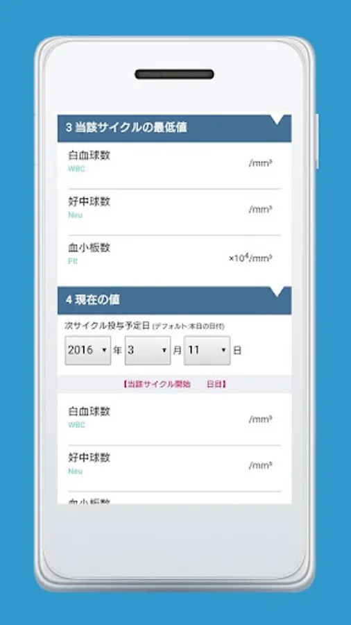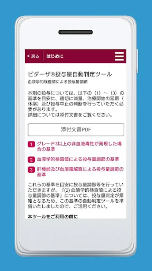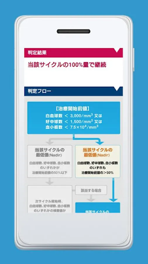 本アプリによる計算結果は、投与基準のひとつである「血液学的検査値による投与量調節の基準」に基づくものです。投与の可否および投与量については、実際の患者さんの状態などに応じて総合的に判断して下さい。