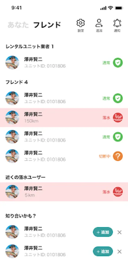 * You can register notification destinations corresponding to your own Falling in Water Detection Unit in the Falling in Water Detection App. In addition, it is necessary for the person to be registered as a notification destination to have a falling-in-water detection app installed in advance.
