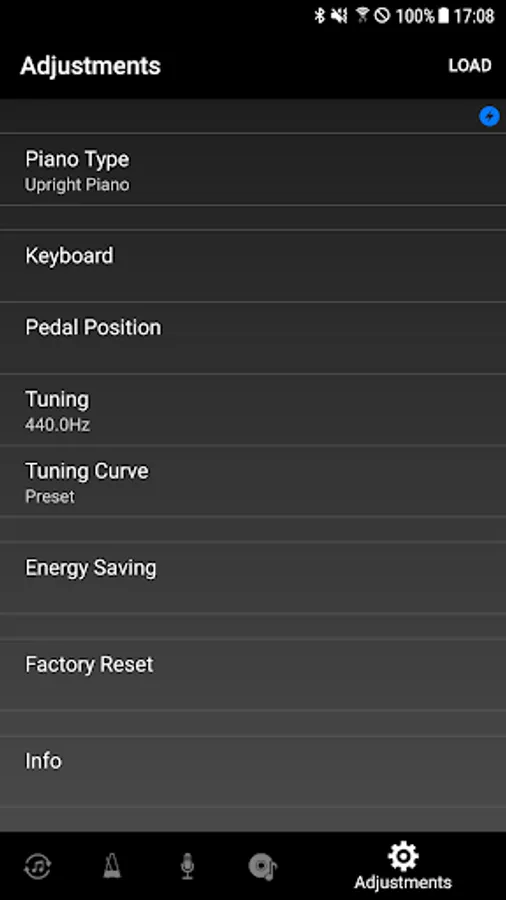 * Adjustments - Piano type, Touch control, Individual key volume, Black key volume, Key depth, Note repeat limit, Pedal position, Tuning, Tuning curve, Panel led, Auto Power Off, Factory reset