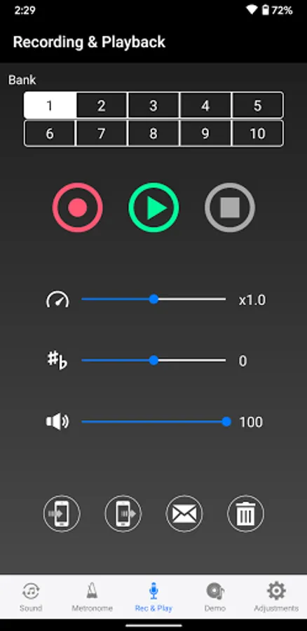 You can also save the performance data from ProRecord to your Android device, where you can send it to someone else via email, or receive new performance data and play it back on your ProRecord system.