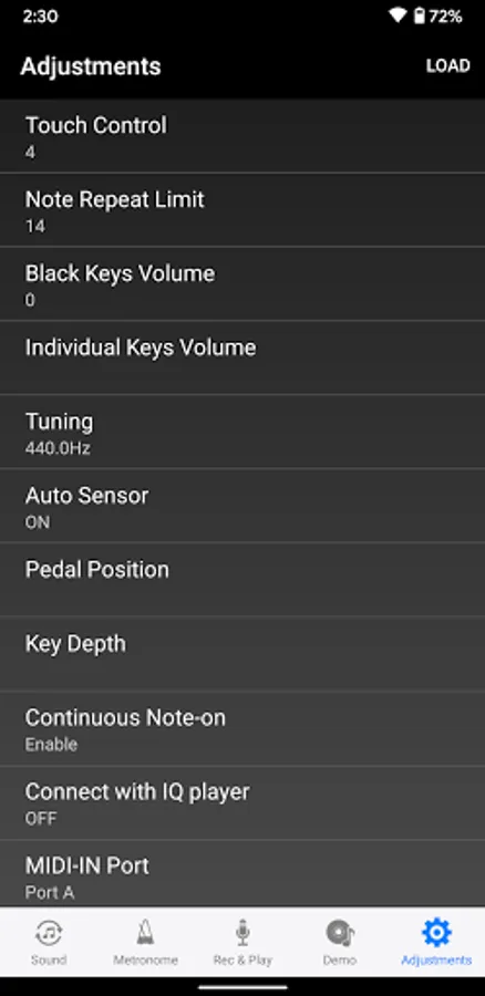 * Adjustments - Touch control, Note repeat limit, Black key volume, Individual key volume, Tuning, Auto sensor, Pedal position, Key depth, Continuous note-on, Connect with IQ player, MIDI-IN port, Panel led, Piano type, Tuning curve, Factory reset