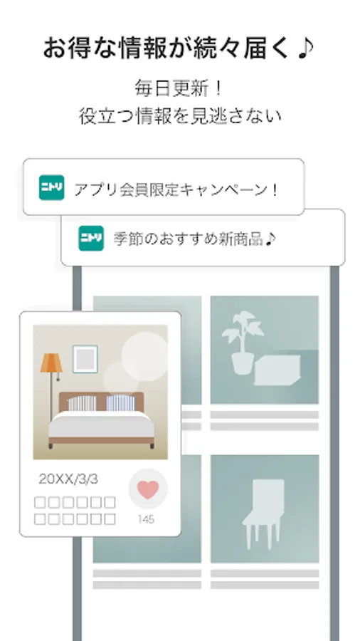 Nitori's official app allows you to search for essential items such as furniture, interiors, and miscellaneous goods that are essential for moving to a new life, such as a transfer, employment, or marriage. It's convenient because you can search for your favorite furniture such as beds and sofas by image search! Coordination problems are also solved.