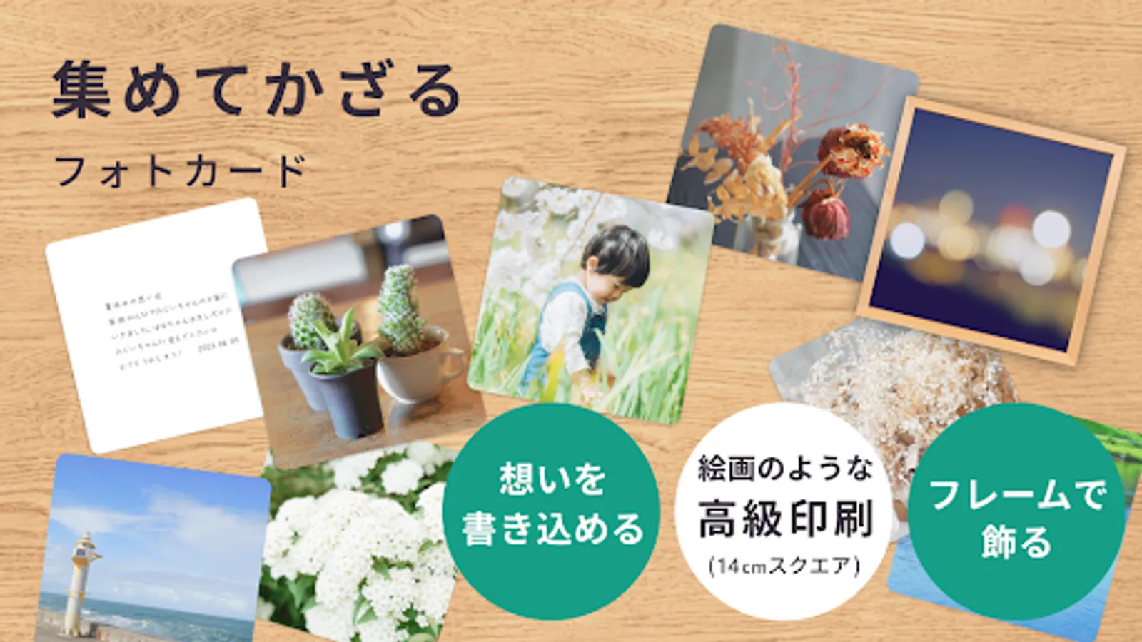 Card-type square photo prints* that can be made for free (shipping fee is 290 yen) for the first month or month after ordering. You can display it on a wall or shelf with the optional frame. It allows you to record your memories and daily life in a style different from that of a photo book.