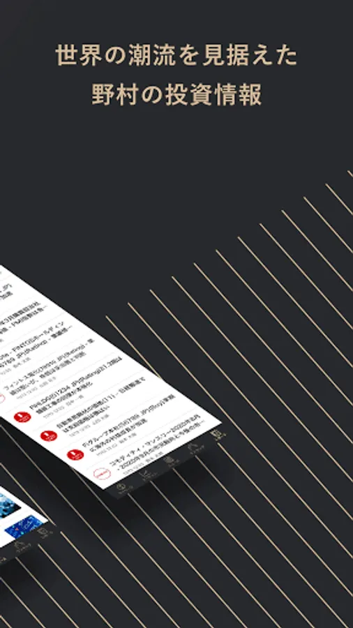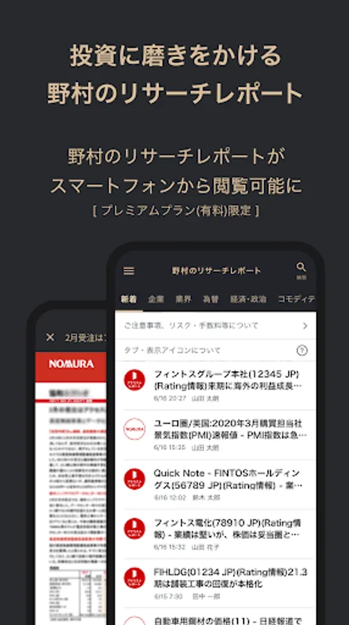 You can view up to 50 Nomura's original "research reports" per month on the app, which cover various genres such as individual companies, industries, foreign exchange, economy, and politics, and are highly rated by professional investors.