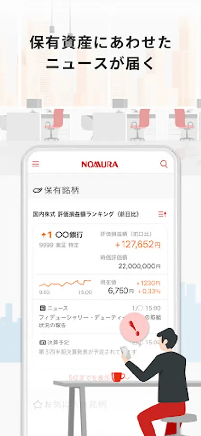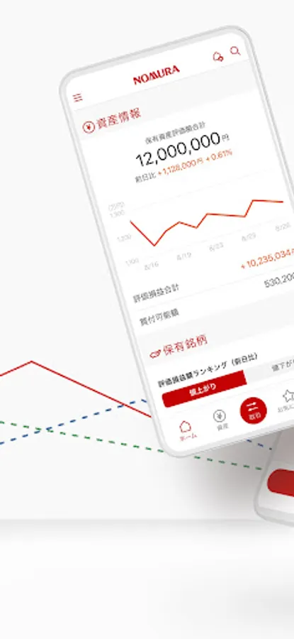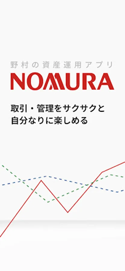 "NOMURA" is an asset management application provided by Nomura Securities. "NOMURA" can collectively manage the status of multiple financial instruments held by customers at Nomura Securities. In addition, you can easily grasp information about your assets and market news in one app, and you can also trade. Why not enjoy smooth trading and asset management on your smartphone?