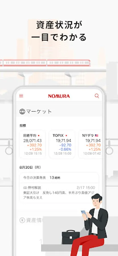 Assets such as domestic and foreign stocks, bonds, and investment trusts that customers have deposited with Nomura Securities can be collectively managed and checked from anywhere using a smartphone. The home screen summarizes the assets held and the market information of the day, and you can easily grasp the asset status by logging in.