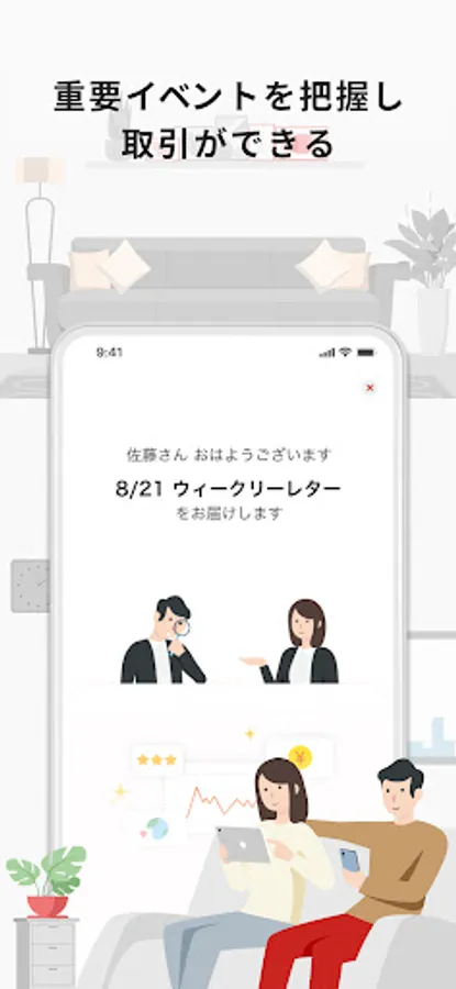 We will send you a weekly letter every weekend. You can look back on the news related to the number of your own trades and holding assets this week. In addition, you can know in advance the important economic events scheduled for the week after the letter arrives and the announcement date of the financial results of the holdings. "NOMURA" supports customers' asset formation by providing a one-stop service from checking the market environment to trading.