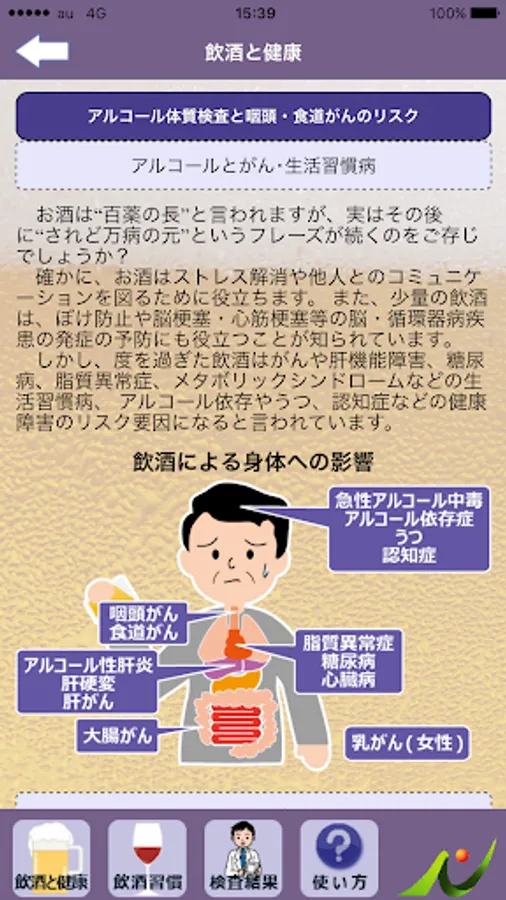 また、あなたの飲酒習慣が健康へおよぼす影響をチェックできます。