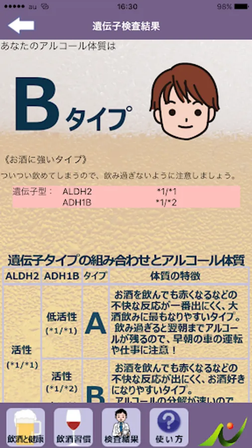 結果は5タイプで表示され、体質の特徴や飲酒の際の注意点をお知らせします。
