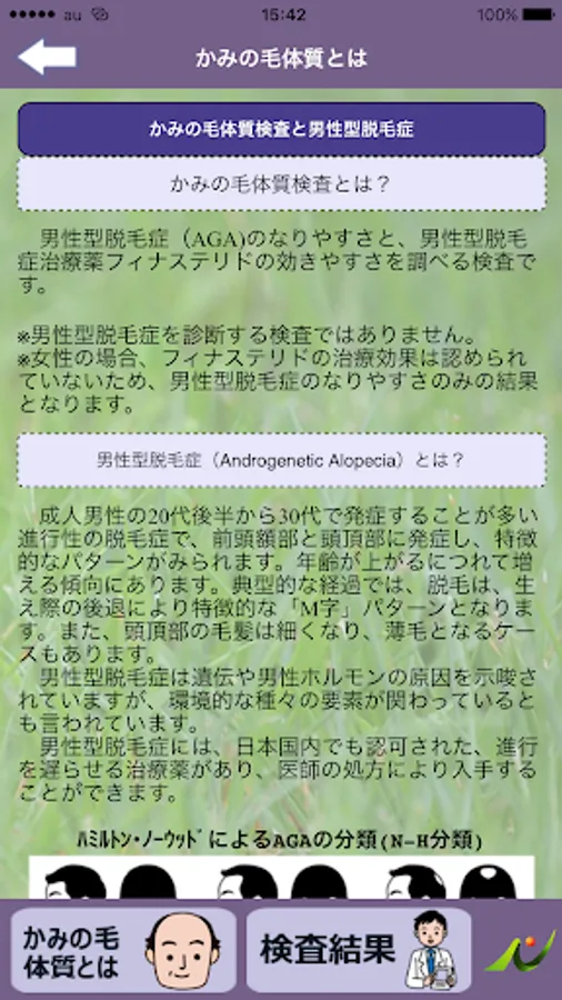 結果は男性型脱毛症のなりやすさ、およびフィナステリドを成分とする治療薬の効きやすさで表示されます。
