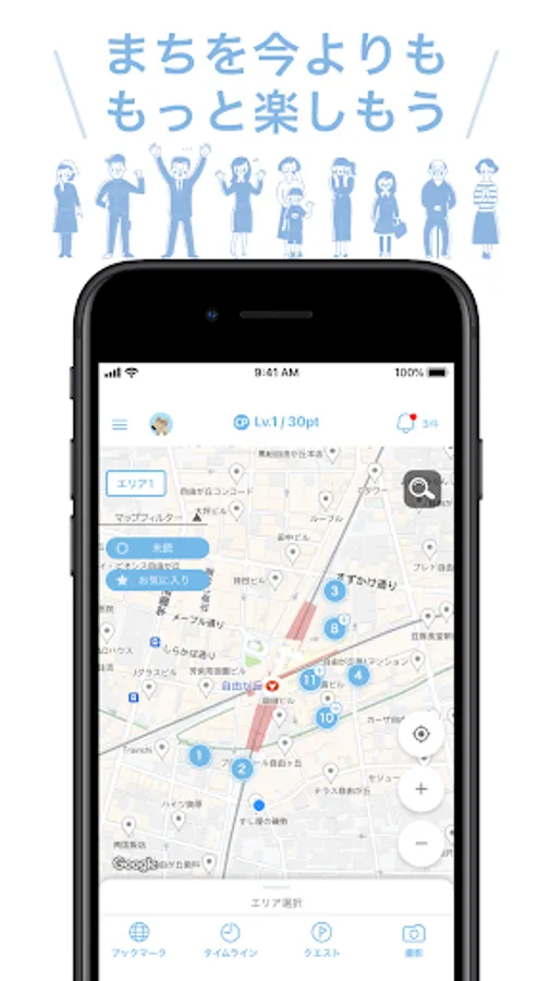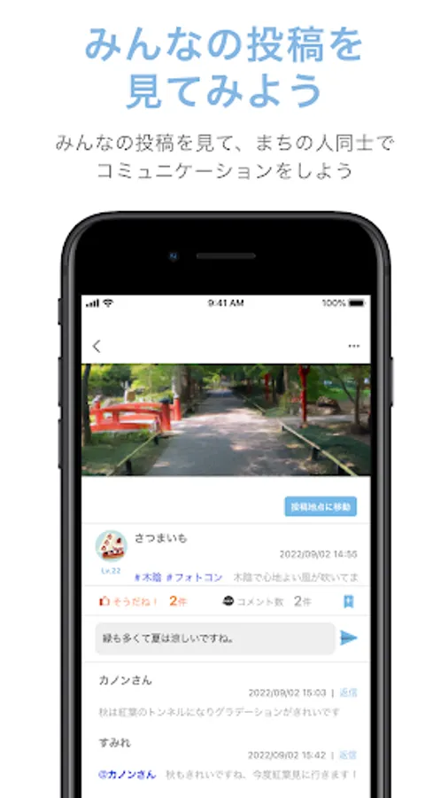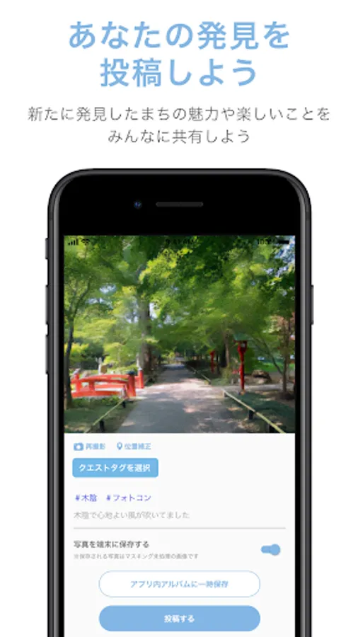 By leaving the photos you took in the town on the spot, you can share them with everyone in the town. It is a new system that makes your town more fun by teaching you the "good points" of the town and consulting on the "problems" of living.