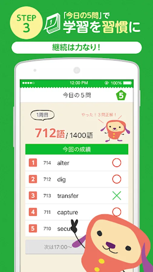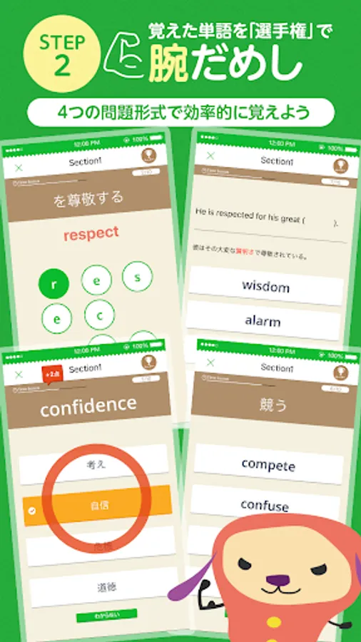 -The question format is four choices (English / Japanese / English / fill in example sentences) and spelling.