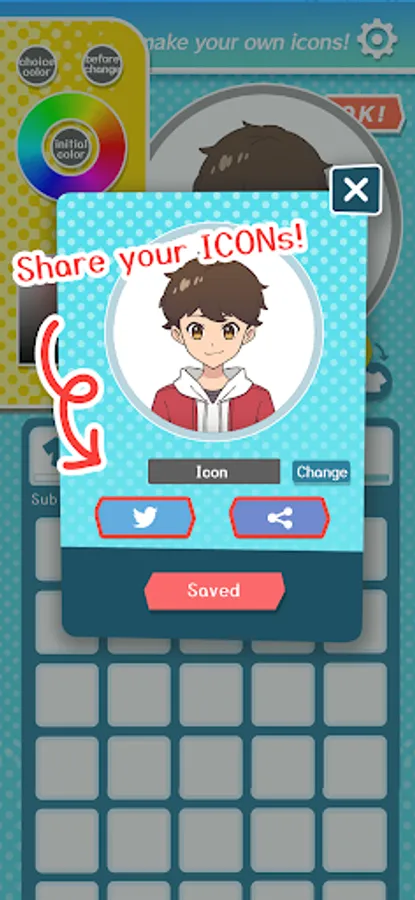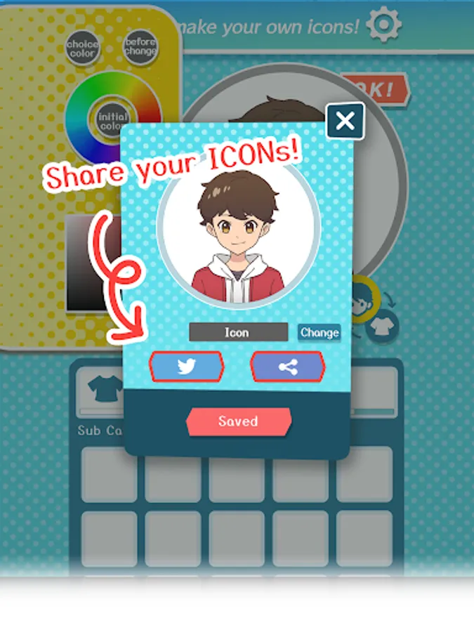 You can also customize the hairstyle, facial expression, eye color, and hair color. Let's have fun sharing and creating icons with your friends!