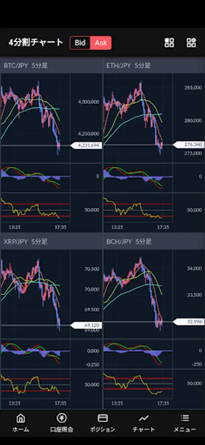 In addition to real-time chart drawing, it strongly supports chart analysis with technical indicators and 4-screen split display.