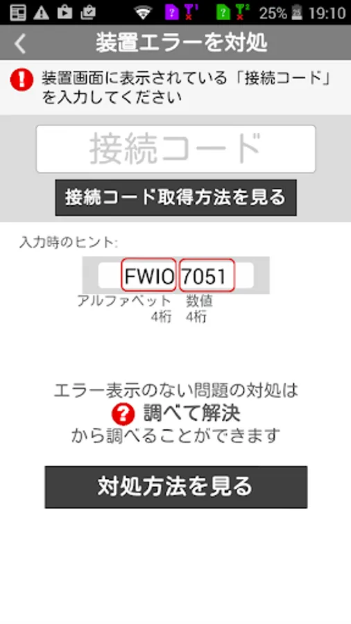 A problem analysis system on the Internet will search for a solution. Enter the connection code displayed on the operation panel of the device to display the search results.