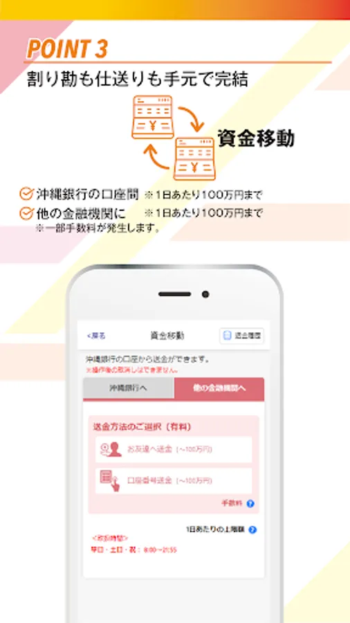 You can send money to the accounts of the Bank of Okinawa and other financial institutions.