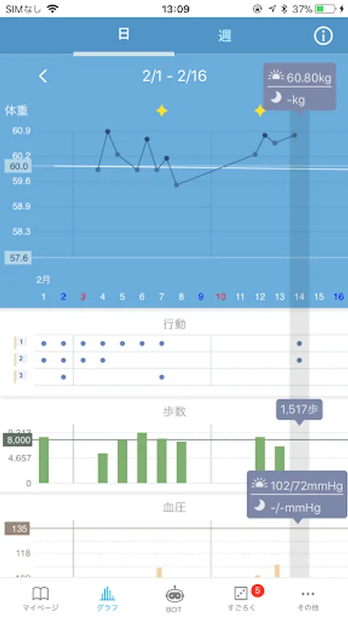 OMRON connectアプリを介して測定機器より取得したデータを管理することができます。それにより、日々変化するデータを手元で確認しながら、目標までの進捗把握を行うことが可能になります。また、測定状況に応じたメッセージング機能、および初回面談時に決めた行動目標と日々の達成状況も記録できるので、継続的に特定保健指導終了までサポートいたします。