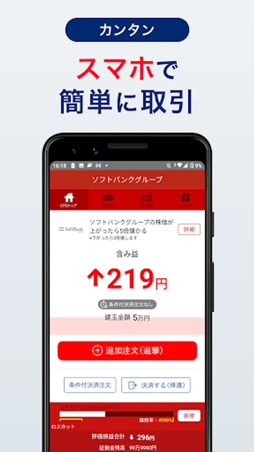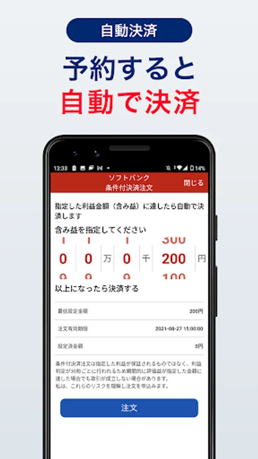 Conditional settlement order is a service that allows you to place a settlement order by specifying the profit amount (unrealized gain) for each Japanese stock CFD issue. You can capture the settlement timing of the specified profit without worrying about the price movement of the stock price.