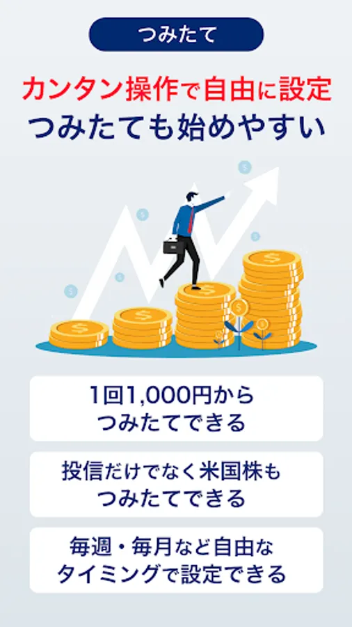 For US stocks and investment trusts, you can make regular investments starting from ¥1,000 once every week or every month.