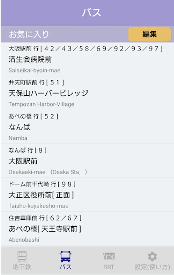 ・お気に入りは50件まで登録ができ、バストップ画面から編集(削除)やスクロールができるようになりました。
