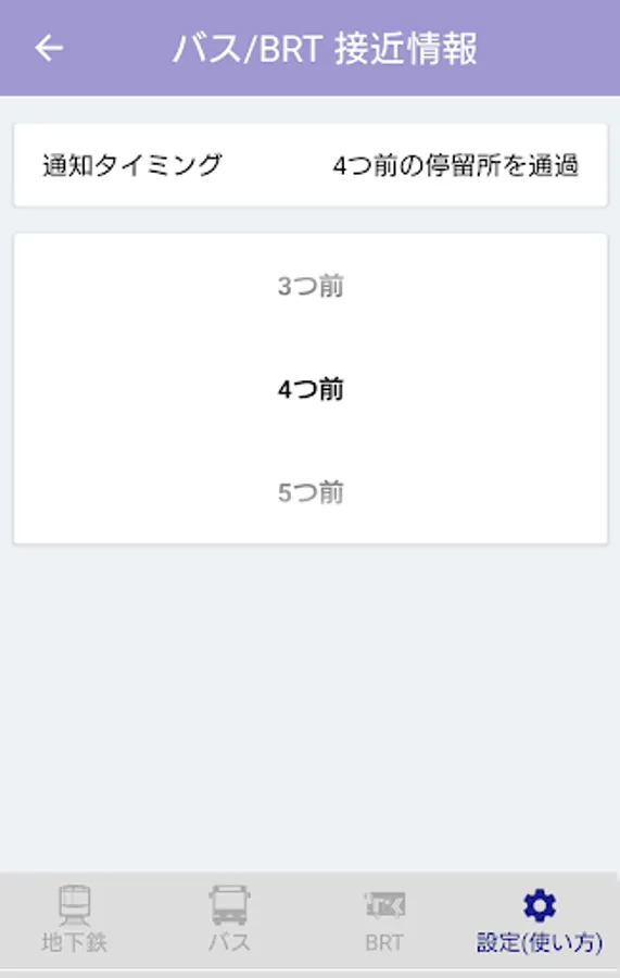・バスとBRTの接近通知のタイミングは対象バス停の2~5つ前の停留所を設定できるようになりました。