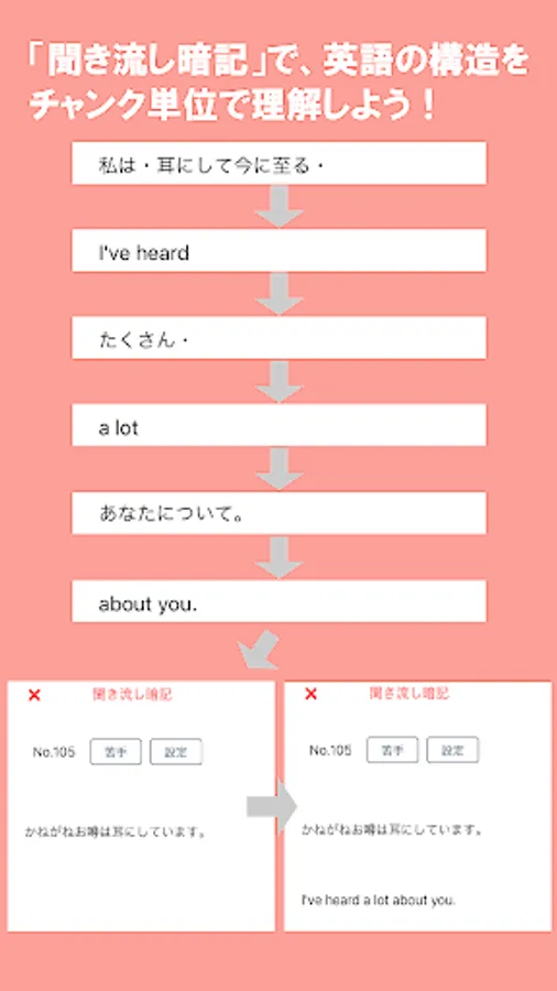 他の聞き流し教材は、英語と和訳の「全文」が「英語→和訳」の順番で流れます。人間の脳は「一度に4秒以上の情報を記憶することが困難」なため、4秒以上かかる「全文」の暗記には大量の反復が必要となります。ですから、多くの学習者が挫折するのです。