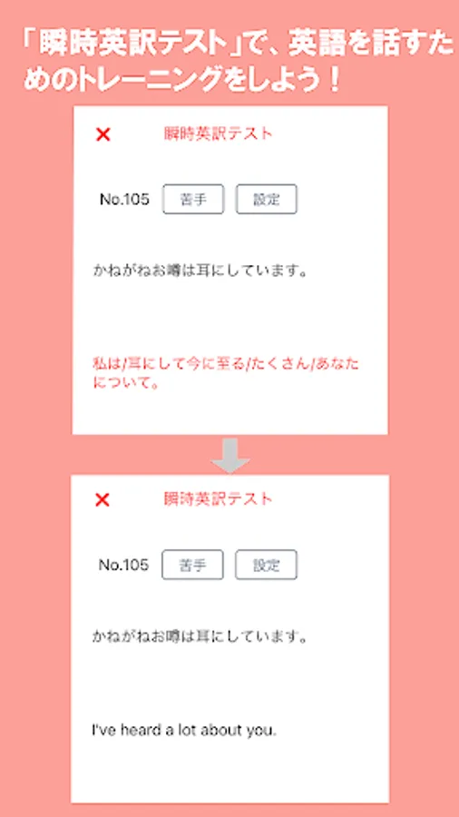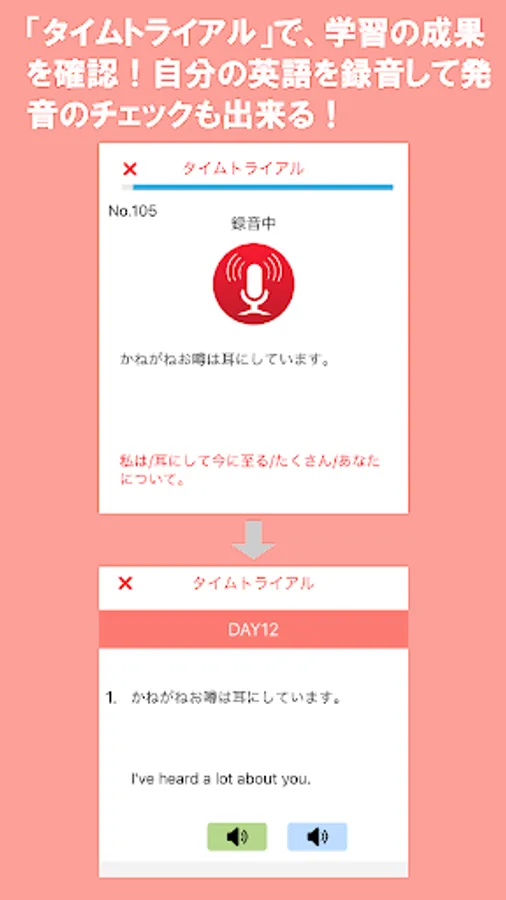 タイムトライアルでは、学習開始と同時にユーザーの皆様が声に出して行った瞬時英訳を録音し、ネイティブスピーカーの音声と聞き比べられます。