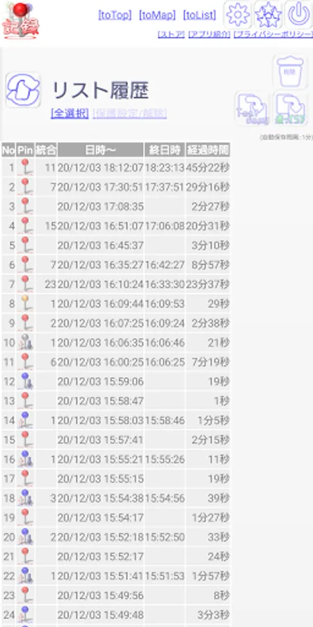 The information that is regularly saved is displayed in a list in real time, and pins are placed on the map.