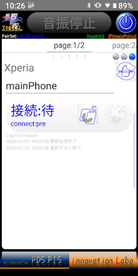 When the smartphone to be searched is in a state where it can receive search commands, the rightmost LED on the upper right turns blue, the "connect" character turns blue, and the center button for connecting can be pressed.