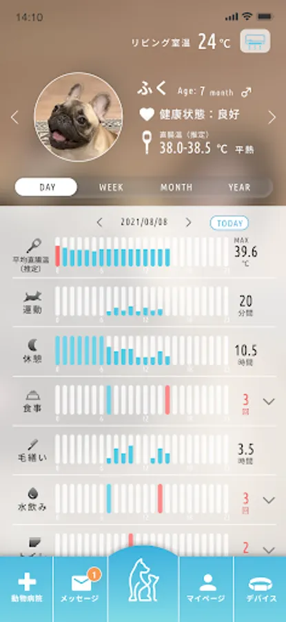 A high-precision 9-axis sensor with the same specifications as a smartphone is used for the dedicated device. Check the number of toilets, meals, drinking water, and the amount of activity. It is also the first in Japan to have a built-in temperature sensor to estimate rectal temperature. You can always see it in the app.