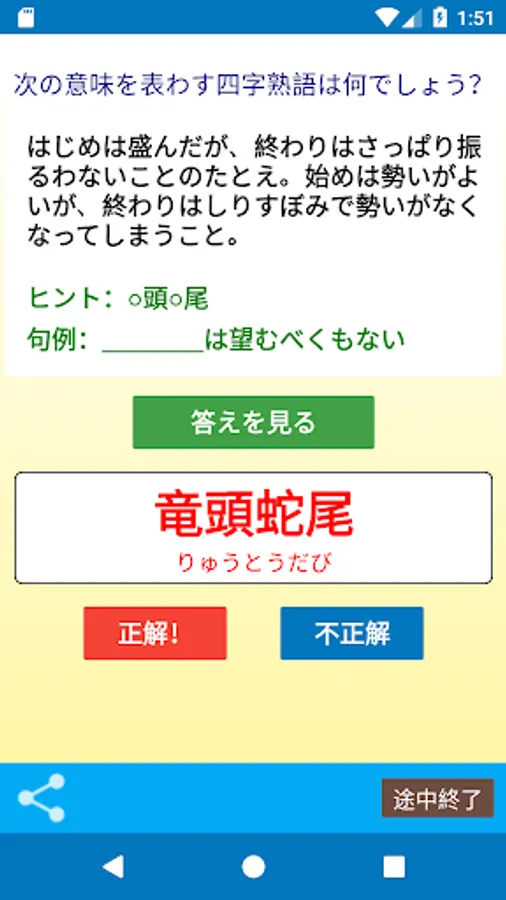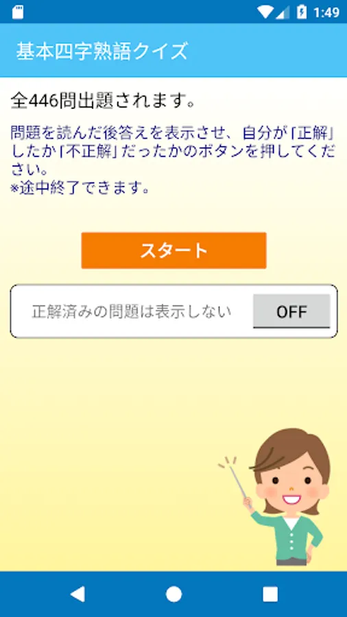 Usage: The question sentence is displayed. After that, press the "See answer" button to display the answer. If you press the button for whether the answer you thought was "correct" or "incorrect", the next question is displayed.