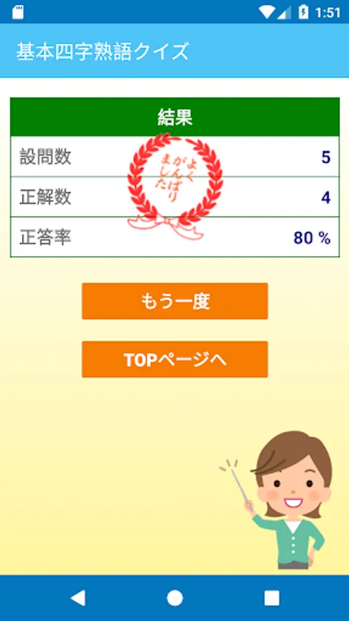 This quiz contains 446 important four-character idioms that adults should remember. By using the quiz format, you can efficiently learn the meaning of the four-character idioms and the kanji notation, and acquire common sense in a short period of time.