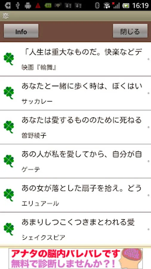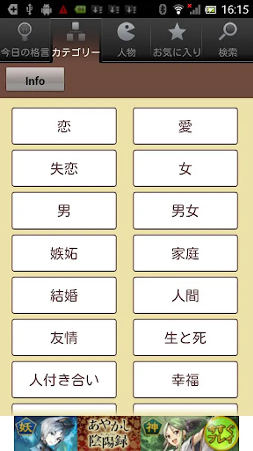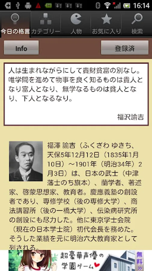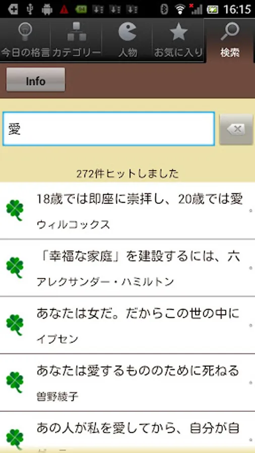 It is an overwhelming volume of quotes dictionary containing 2,500 quotes and proverbs from all ages and countries that will enrich your life and give you guidelines for your life when you are lost or troubled. In addition to being able to search by category and author, full-text search is also possible with any word. In addition, it has a "favorite" function that allows you to register your favorite quotes, and a "quote of the day" function that displays a different quote every day.