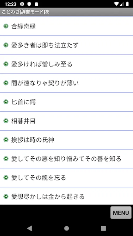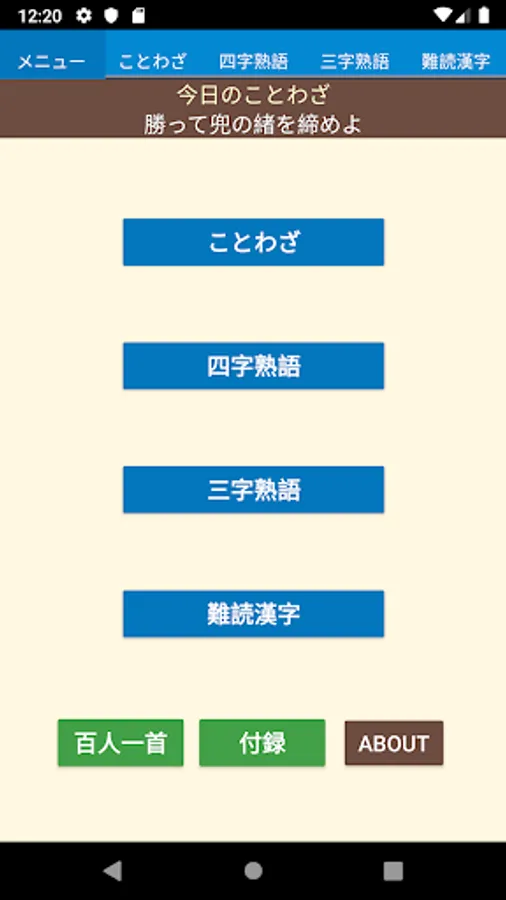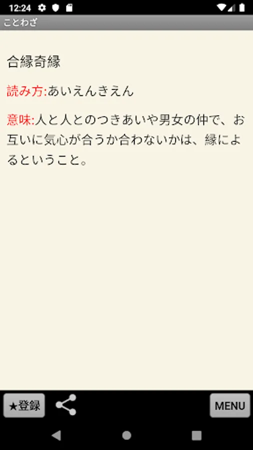 4369 words (meaning) of proverbs and facts, 3166 words (meaning / same synonyms) of four letters, 640 words (meaning) of three letters, 2040 words of difficult-to-read kanji (reading), and an overwhelming volume as a free application A simple learning dictionary containing content. When a proverb or idiom that you do not know in your daily life comes out, you can immediately find out the meaning. In addition, the “Four-word idioms” cover idioms corresponding to Hanken Level 2, Semi-Level 1 and Level 1.