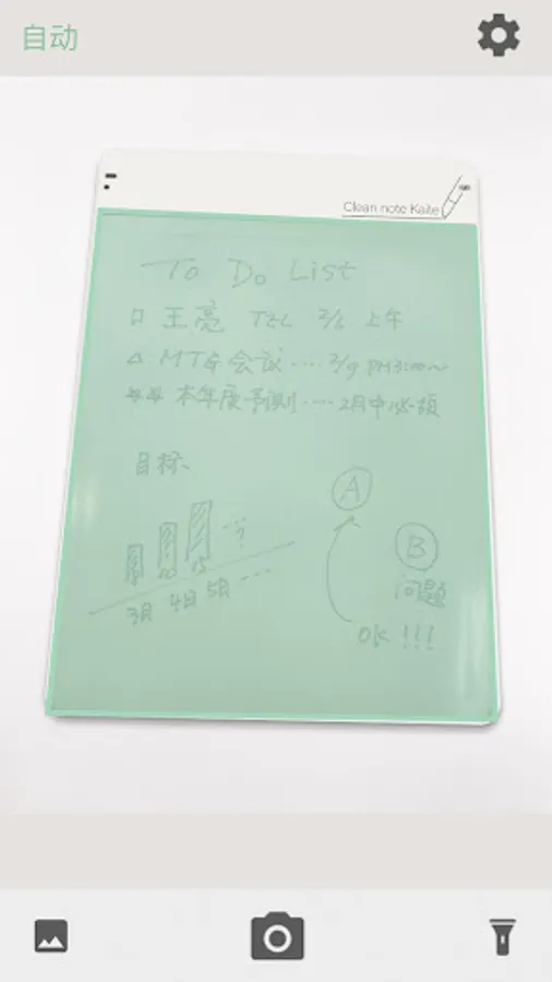 摄像头对准普乐士环保书写魔(Clean note kaite)板将书写魔板完全进入摄像画面,软件自动读取书写面后自动拍摄(自动模式时)。软件会自动对拍摄时倾斜的画面进行校正,转化成清晰的数据图片。