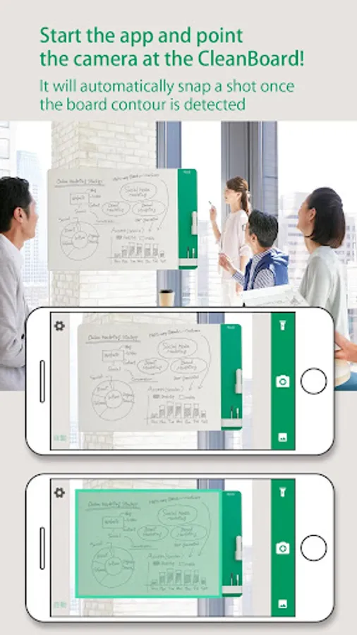 Start this App after installation to shoot the CleanBoard surface (where writing exists). This action will enable the app to automatically detect the contour of the writing surface and creates an enhanced digital data image after corrections such as keystone correction (data format is your choice of JPEG or PDF). You can easily share or organize the data saved in the camera roll and send via email or store in the cloud.