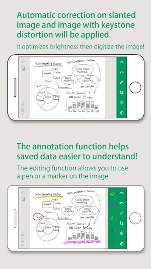 When the written surface of CleanBoard is within the shooting range, Clean board automatically recognizes the written area and snaps the image. The App corrects the tilt and keystone to create an optimized image.