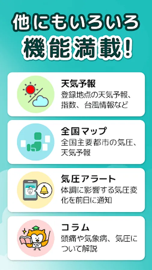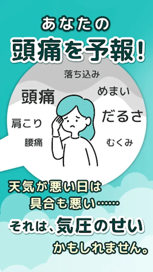 A physical condition management app based on atmospheric pressure forecasts devised by a weather forecaster, focusing on pain such as headaches caused by fluctuations in atmospheric pressure, which is called "weather disease". You can check the timing when pain is likely to occur on the barometric pressure forecast graph.